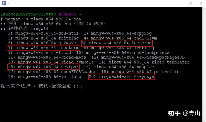 #pacman -S mingw-w64-x86_64-eda分别选择yosys、nextpnr、icestorm、icesprog软件包安装即可,亦可根据自己需求选择其他软件包安装如gtkwave, verilator等。